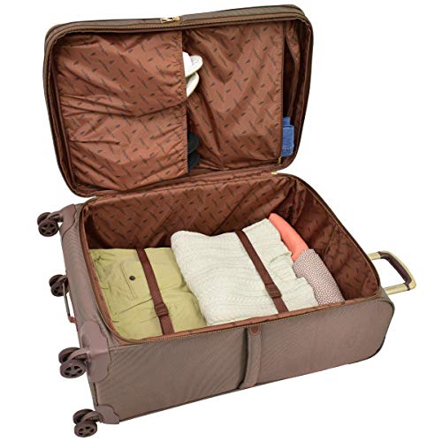 - Full London Fog signature lining, interior shoe pockets, zippered pocket and tie down straps that hold clothes securely in place.