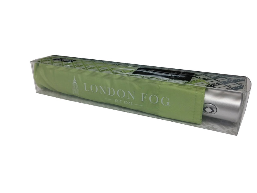 Details: The London Fog tiny mini auto open auto close umbrella is lightweight, thin and functional. The umbrella frame is constructed from a lightweight aluminum framework using a combination of fiberglass and aluminum elements. The umbrella features a one touch auto open and auto close button, making it easy to get in and out of the rain. In the folded position, the umbrella is 10 inches in length and weighs a mere 9.0 ounces. When opened, the canopy stretches to a full-size arc coverage of 41 inches.