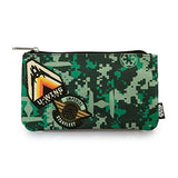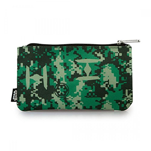 Details: Star Wars Rogue one nylon travel bag by Loungefly. Licensed by Star Wars. Front features a Starfleet patch and a U-Wing Fighter patch. Use for cosmetics, school supplies, dice, or travel. Lined in white and light-grey pinstripe material. Made of heavy woven nylon. Zip closure with Loungefly silver-tone embossed zipper pull. Star Wars exterior tag. Measures 8 in x 4.5 in. Pattern layout will vary so not every piece will look identical.