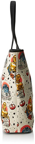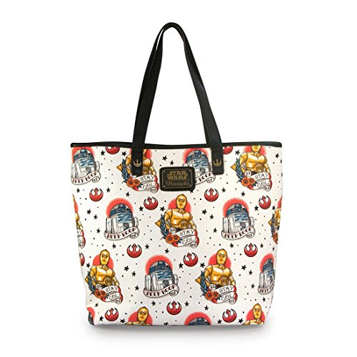 Details: Tattoo style canvas print tote featuring R2D2 and C3PO. Featuring a large R2D2 faux leather applique illustration on the front. Bag has a magnetic snap closure. Interior includes 1 open pocket and 1 zippered pocket. MEASUREMENTS: W: 14" X H: 14" X D: 6"