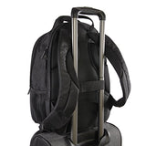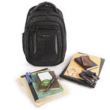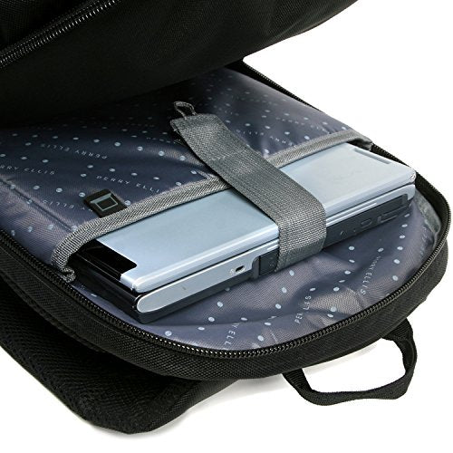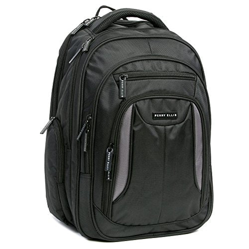 Details: The Perry Ellis M160 Business Laptop Backpack is perfect for any business trip. The padded laptop compartment can fit a laptop with a 15" screen. 6 exterior pockets provide enough storage space for documents, cell phone, keys, business cards, and pens. Airport travel is made easy with a luggage strap located on the back of the backpack. 12.5" x 11.5" x 18"