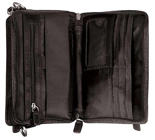 Details: Versatile enough for men and women to carry, this sleek shoulder bag is perfect for all types of day to day travel. The Mancini Leather Goods Deluxe Unisex Shoulder Bag is crafted from drum dyed Colombian leather and features an extra-small shape with multiple storage pockets for organization, a detachable wrist strap, and a detachable shoulder strap. This compact bag is equipped with RFID blocking technology and includes a zippered main compartment, zippered pockets on the front and back, and a front zipper pocket with a magnetic flap closure. A zip around wallet compartment includes a zipper pocket for coins, a slip pocket for cash, a pen slot, a clear ID window, and card slots to hold credit cards and debit cards.