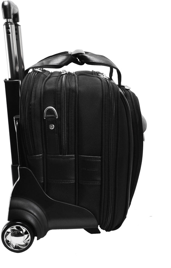 Patented 2-in-1 Removable Wheel and Handle System. Front zipper pocket for small miscellaneous items. Front organizer pocket for media devices, cell phone, business cards, key holder and pens. Front compartment duals as an easy overnighter or an electronic device storage space. Middle compartment provides room for document needs and includes a detachable laptop briefcase. Back compartment padded to protect most laptops up to 17" in size. Dual Laptop Protection System uses a high-tech ABS honeycomb frame to protect laptop from exterior impact and a 10mm high-density foam to help absorb shock and prevent moisture intake. Protective Weatherproof Cover. Advanced, non-slip, shock absorbing neoprene Comfort Flex Shoulder Strap stretches for comfort, alleviating body strain.