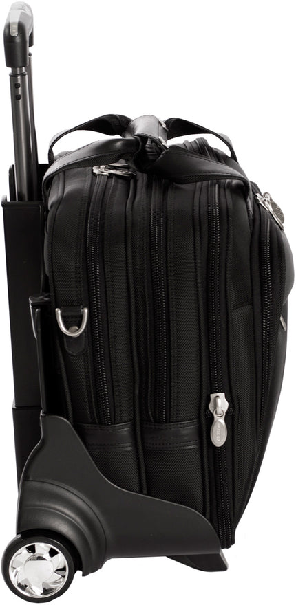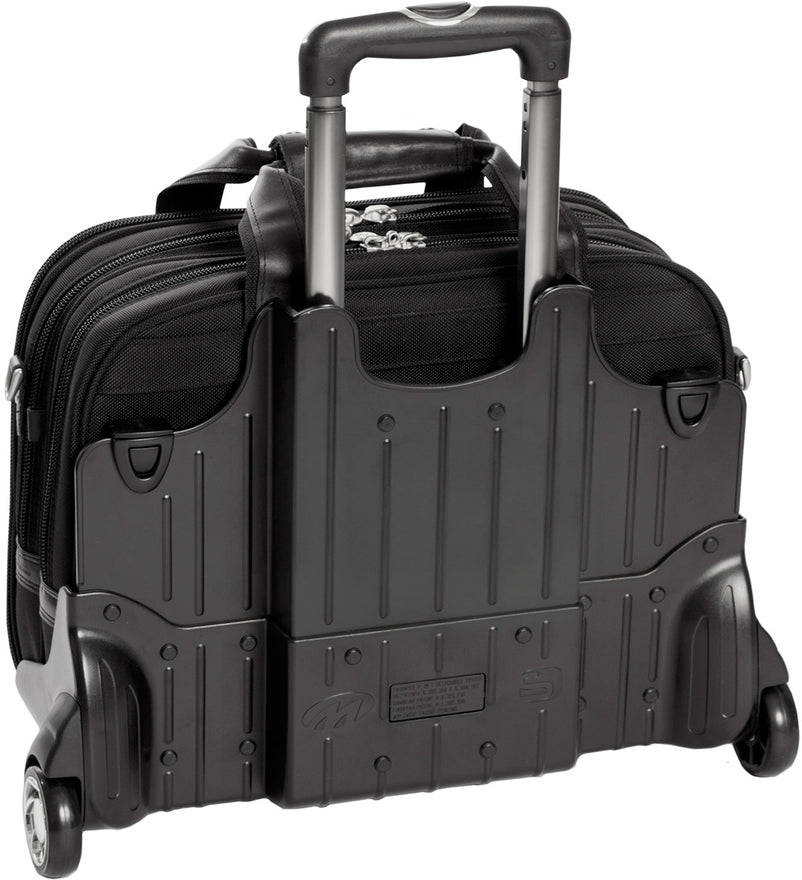 Patented 2-in-1 Detachable Wheel and Handle System. Front zipper pocket for small miscellaneous items. Front organizer pocket for media devices, cell phone, business cards, key holder and pens. Front compartment features a 3-file divider that expands 2" to allow 30% more space. Back compartment padded to protect laptops up to 17" in size. Dual Laptop Protection System uses a high-tech ABS honeycomb frame to protect laptop from exterior impact and a 10mm high-density foam to help absorb shock and prevent moisture intake. Smart Attachment Strap Attachment allows transport on extended handles of other rolling cases and luggage. Bonus. Protective Weatherproof Cover. Comfortable, non-slip, shock absorbing shoulder strap helps alleviate body strain.