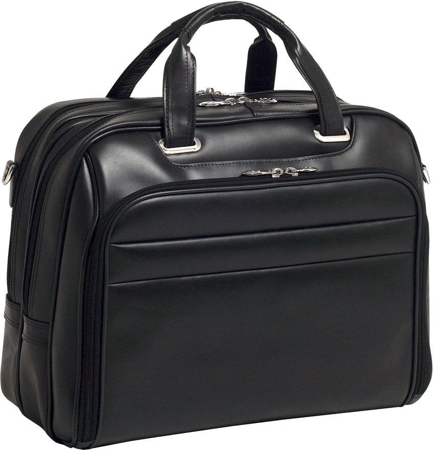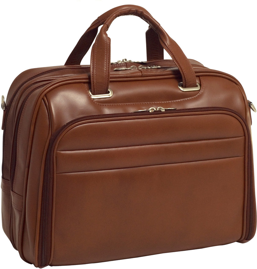 Secure, detachable patent pending Fly-Through Checkpoint-Friendly laptop sleeve design. Laptop sleeve padded with high-density foam fits most laptops 17 in screen size. Adjustable, non-slip, shock absorbing shoulder strap alleviates body strain. Front organizer with storage space for media devices, cell phone, business cards, key holder and pens. Front compartment features 2 small pockets and storage space for files. Smart Zipper Attachment allows transport on extended handles of other rolling cases and luggage.