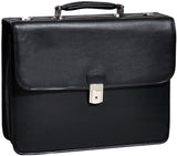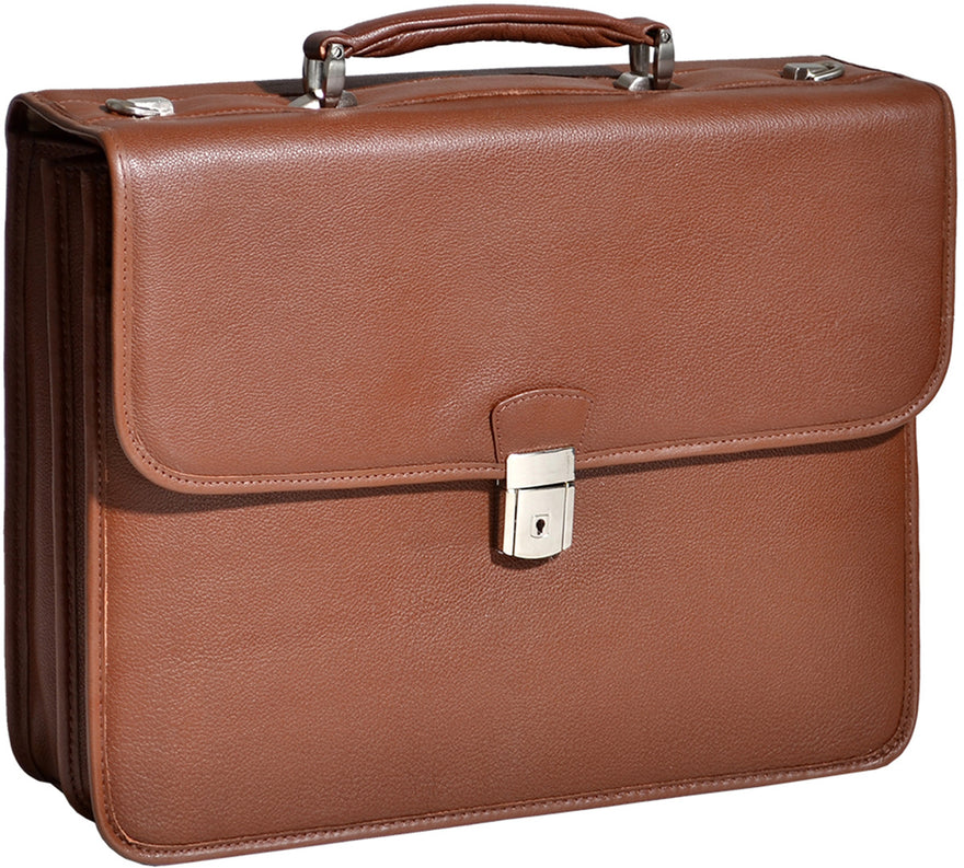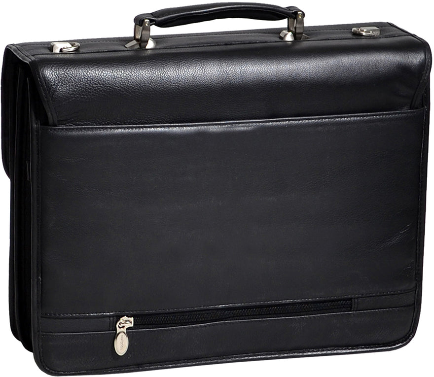 Clean, front flap-over design with a secure clasp. Front section with an interior organizer for pens, business cards and small devices. Main compartment features dual secure zippers, space for files, built-in padded laptop sleeve and dual small accessory pockets. Quick, accessible back pocket for documents. Adjustable, non-slip, shock absorbing shoulder strap alleviates body strain. Main compartment features a built-in padded laptop sleeve that fits and protects most laptops up to 15.4" in screen size.