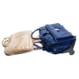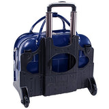 Details: Patented 2-in-1 removable wheel and handle system. Fly-through checkpoint-friendly design with secure, removable padded sleeve that fits laptops up to 15.6”. flap over front pocket with key lock for added security. Small front pocket secured by flap with turn lock. Main compartment divided by secure zipper pocket. Interior organizer section for business cards, pens, keys, cell phones and notepads. Interior zipper pocket. Includes tablet pocket. Weatherproof Cover. Leather shoulder strap. Orange, Green, Blue, and Pink cases are trimmed in sand.