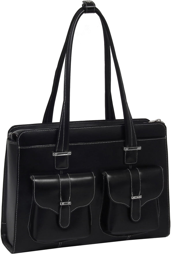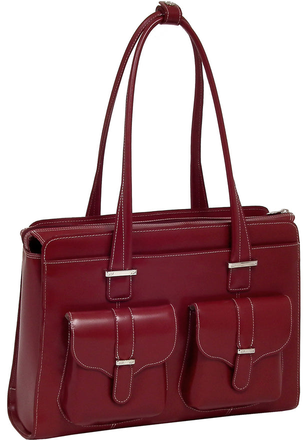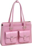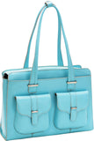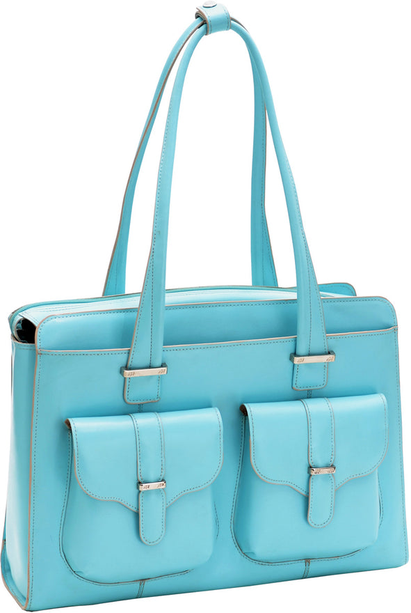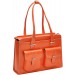 Two small front pockets with magnetic snaps. Front and back pocket for files. Main compartment divided by secure zipper pocket. Built-in padded laptop sleeve that fits laptops up to 15.4 in. Interior organizer section for business cards, pens, keys, cell phones and notepads. Tubular over the shoulder straps Orange, green, blue, and pink cases are trimmed in sand.
