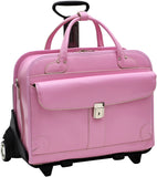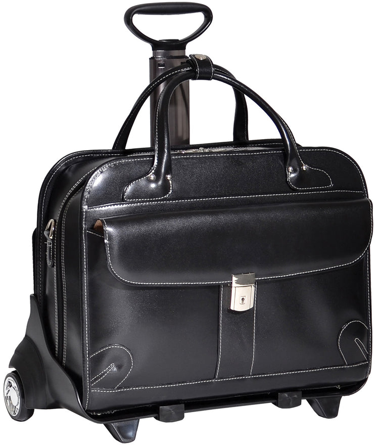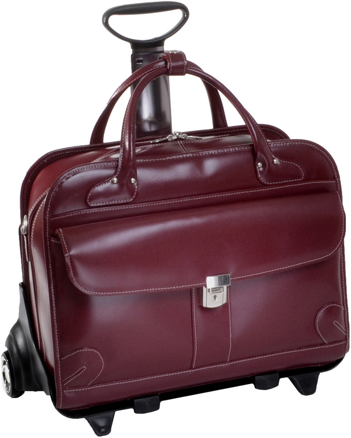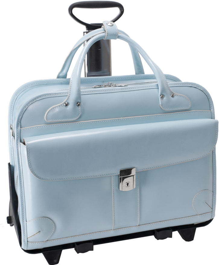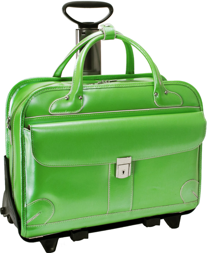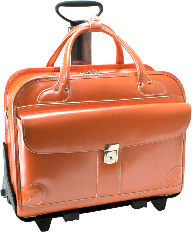 Patented 2-in-1 Removable Wheel and Handle System. Fly-Through Checkpoint-Friendly design with secure, removable padded sleeve that fits laptops up to 15.4 in. Flapover front pocket with key lock for added security. Main compartment divided by secure zipper pocket. Interior organizer section for business cards, pens, keys, cell phones and notepads. Interior zipper pocket. Weatherproof Cover. Leather shoulder strap. Orange, green, blue, and pink cases are trimmed in sand.