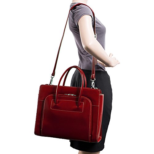 Details: Sleek, contoured design features a top zipper allowing easy access to the main compartment Front organizer zipper section with storage space for media devices, business cards, key holder and pens Interior zipper pocket to help organize Double compartment divided by secured zipper pocket for important documents Practical and stylish tubular leather arm straps Matching leather shoulder strap with non-slip neoprene absorbs shock and alleviates body strain Removable high-density laptop sleeve that protects laptops up to 15.4¿ in size