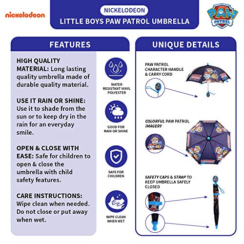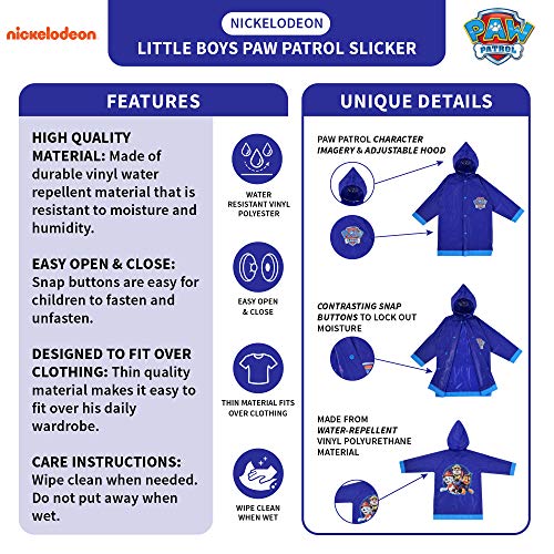 Details: He'll be ready for action no matter the weather in this fun paw patrol rainwear set. The adorable rain slicker and matching umbrella feature imagery of chase, marshal, and rubble from the popular Nickelodeon cartoon. Available in your choice of 2 colors: blue and purple. Designed for toddler and little boys and available in different sizes for ages 2-5, the rain slicker is moisture and humidity-resistant. Snap buttons are easy for children to fasten and unfasten. The thin but durable vinyl slicker fits easily over his clothing to keep him comfy, and an adjustable elastic hood helps keep him protected from the rain. A matching 8-panel umbrella with alternate chase, marshal, and rubble imagery with 'heroes work together' Messaging and has protective caps on all points. A character handle depicts his favorite paw patrol buddies and has a convenient nylon carrying cord. A velcro closure strap lets children easily fasten the umbrella for comfortable carrying. The instantly recognizable Nickelodeon characters are sure to be a hit on the playground. With his paw patrol puppies at his side, your little boy will be up for any wet-weather adventure.