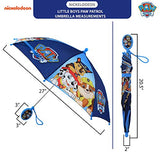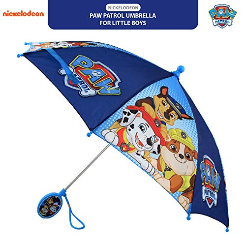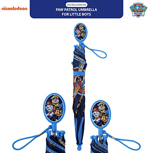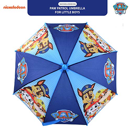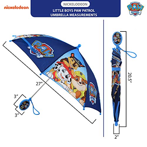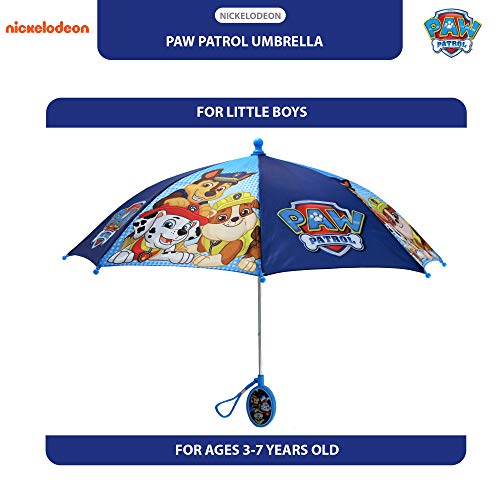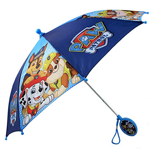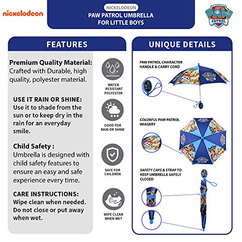 Details: A rainy day is no match for your favorite paw patrol pups from adventure bay. Let marshal, chase and Skye bring some rescuing action for your little boy on this wet and gloomy day. The stylish character umbrella features colorful imagery of the popular paw patrol show from Nickelodeon. Designed for little boys ages 3-7, the 8 panel umbrella is designed in a blue color scheme and features alternating paw patrol imagery with blue protective caps on all points. Available in your choice of 2 colors. Dark blue or black/Blue. The fun character handle features a paw patrol design and has a safety velcro closure strap ensuring your child stays safe while easily opening and closing it at any time. Also included is a convenient nylon carrying cord for comfortable carrying. Whether he's running through the rainy adventure bay streets or jumping in puddles on the school playground, this Nickelodeon character umbrella is sure to make a splash!