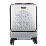 - 8 multi directional spinners wheels, telescoping handle 21' inch, metal zipper closure with nl monogrammed zipper pull.