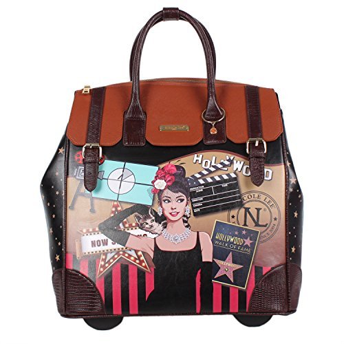 Details: Sophisticated and stylish rolling business tote sets the tone for every trip you take. Exterior features: faux leather handles and trim, 2 front buckle embellishments, top zipper closure, back zip wall compartment for retractable handle, back wheels for easy rolling and Nicole Lee nameplate in front. Interior features: large storage space, zip wall pocket with metal Nicole Lee nameplate in front compartment, padded laptop compartment fits up to 15" notebook with velcro strap and giraffe print with NL logo satin lining. Dual top handles with 4 inch drop. Retractable handle extends up to 24 inches from the body.