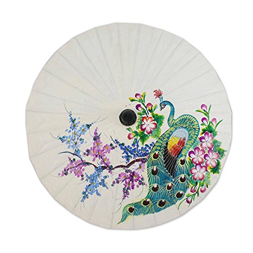 About this item: The vibrant plumes of a peacock sway across the crest of this saa paper parasol from northern Thailand. By Nikom, the piece is embellished with bamboo spines and hand-painted with intricate designs in oil paints.