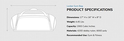 Details: The Locker Bag was OGIO's first innovation and remains one of the most highly engineered gym bags in the market. Its sturdy structure is designed both to fit into and work like a locker, while other intelligent features include a shelf separating clothes from shoes (up to a men's size 13), plus internal organization pouches, and an external magazine/racquet pouch. 17"h x 16"w x 8"d 1900 Cu.In/32 L 4.45 Lbs/2.0 Kg 420D dobby nylon / 600D poly.