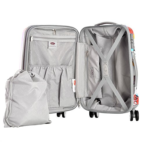 Details: Constructed of durable polycarbonate abs for long life, this dual spinner case has wheels, that allow free movement in all directions while supporting it's own weight, highly polished retractable push button reinforced handle, interior hanging zipper pocket and buckle tie belt