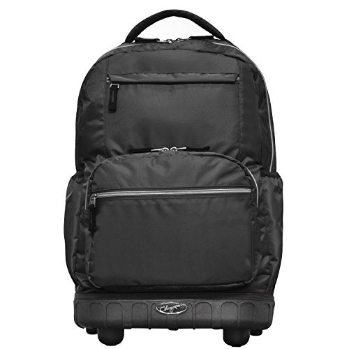 Details: Travel in style with this Olympia Melody 19' Rolling Backpack. Constructed of durable ripstop polyester, it holds up trip after trip. It features corner cut jumbo recessed wheels for smooth gliding and a push-button telescopic mono handle for maneuverability. This travel rolling backpack has a color-matched bottom mold for protection and hideaway padded shoulder straps. Multi-front zippered pockets with an internal organizer help keep your items secure.