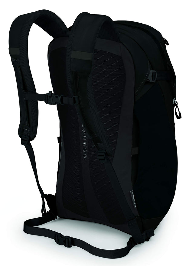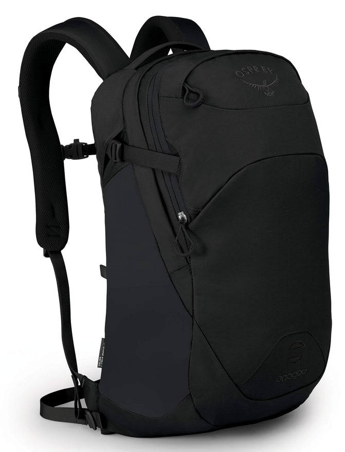 Details: The Osprey Apogee laptop backpack is a streamlined pack with functional features. The front panel organization pocket keeps all your small items handy while the large main compartment has plenty of room for all your essentials. Inside the main compartment is a padded laptop sleeve that fits a 15” laptop along with a separate padded zippered tablet sleeve. The Apogee daypack also features discrete side access dual stretch mesh water bottle pockets. While there are upper side compression straps to keep the contents of your bag secure, you can tuck them away in the hidden garage pocket when not in use. It can also be used as a bike commuter pack with the blinker light attachment and a heat embossed scratch-free slash pocket for your sunglasses.