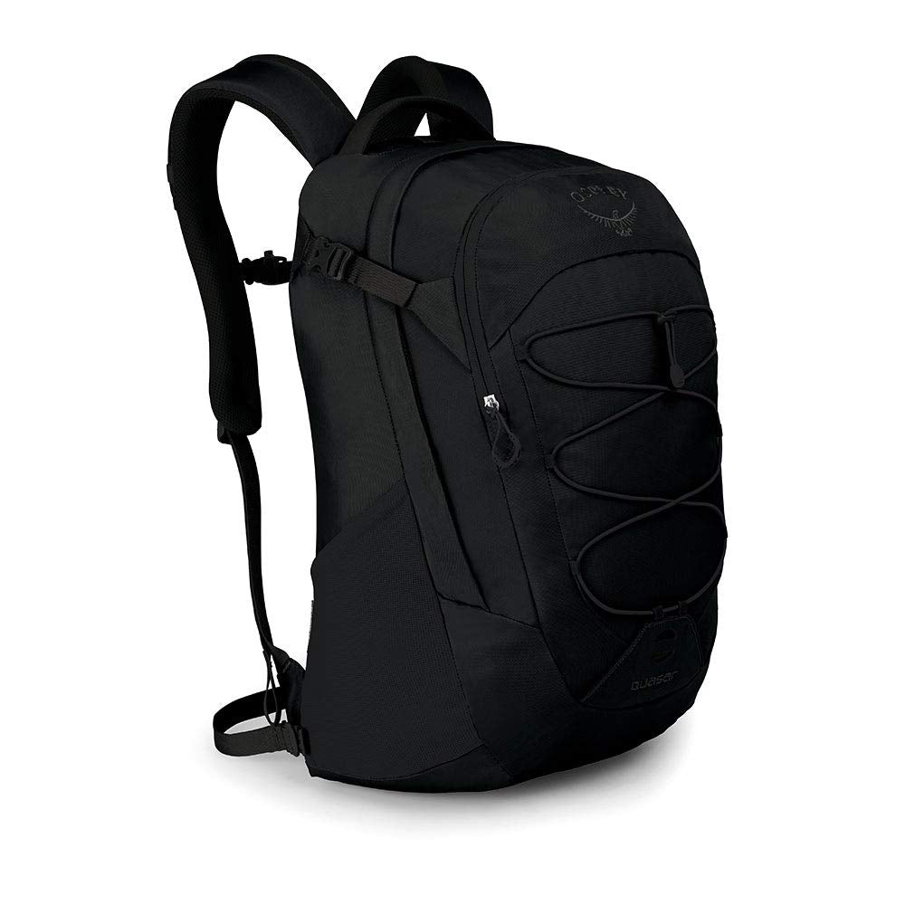 Details: The Osprey Quasar men's laptop Backpack is a feature rich daypack. Starting with the front panel organization pocket where you can store your pens and cords along with a key clip for security. The quasar bag has a padded laptop sleeve that can fit up to a 15-inch laptop. It also has a separate zippered tablet sleeve and magazine/document sleeve. You can then ensure you stay hydrated on a busy day with dual stretch mesh water bottle pockets. You can use the upper compression straps to make sure the contents of your pack stay secure and in place. It can also be used as a bike commuter pack with the blinker light attachment and a heat embossed scratch-free slash pocket for your sunglasses. Lastly, the front panel bungee cord allows for quick storing of a jacket while you are on the move.