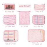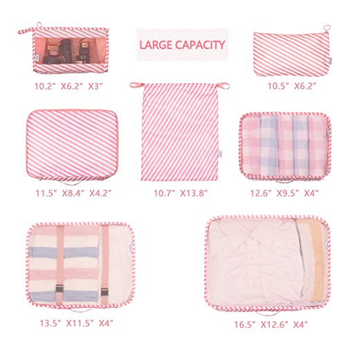 - INCLUDING 7 PCS TRAVEL LUGGAGE ORGANIZERS: Includes 3 different sizes of packing cubes organizers( large:10-12 shirts, medium:7-9 Shirts, small: 5-6 shirts), 1 bra underwear bag,1 toiletry bag, 1 laundry bag and 1 zippered bag. Easy to pack your all luggages well in your 21-25 inches suitcase, carry-on bag, drawers and backpack, great for short or long trip