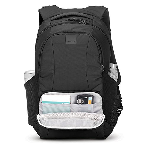 The revamped Metrosafe LS450 Anti-Theft 25L Backpack from Pacsafe stays true to its classic design heritage, while providing functionality and seamlessly integrated security technology. The bag's fabric is embedded with eXomesh slash guard, a lightweight flexible, stainless steel wire mesh that protects your gear from a quick slash-and-run theft. Flexible, stainless steel wire runs through the adjustable Carrysafe slash guard shoulder straps to help prevent slashers from slicing through and running off with your gear, while the Turn & Lock Security Hook attaches the bag to a fixture for added security. The Lockabout Security Clip and Smart Zipper Security provide multiple layers of protection and lockdown points for zippers to help protect against pickpockets. The RFIDsafe blocking pocket helps prevent your data (such as from e-passports, credit cards, and key cards) from falling into the wrong hands.