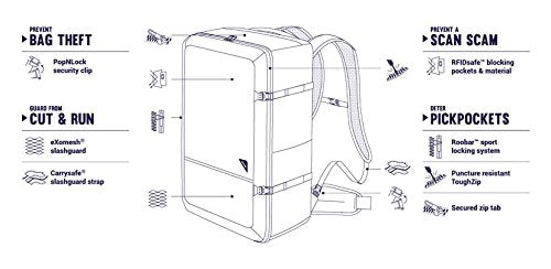 The bag's fabric is embedded with eXomesh Slashguard, a lightweight flexible, stainless steel wire mesh that protects your gear from a quick slash-and-run theft. Flexible, lightweight stainless steel wire runs through the adjustable Carrysafe Slashguard shoulder straps to help prevent slashers from slicing through and running off with your gear. The bag includes a PopNLock security clip on the top of the right strap, as well as smart zippers that interlock and can be secured to the Roobar Sport locking system, which locks down the all zippers in one place, helping prevent pickpockets.