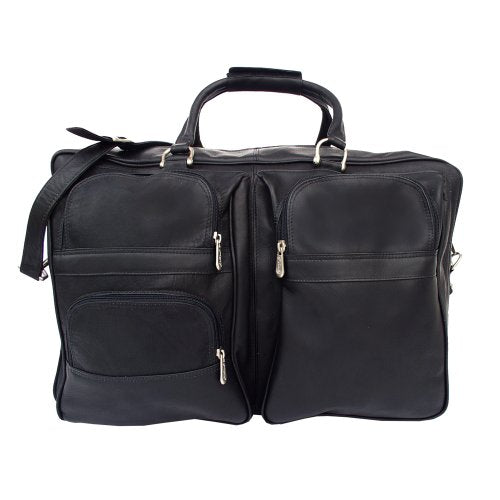 Details: Top-zip opening to roomy main compartment. Rear zip compartment with elastic straps to secure clothing and interior zip-pocket, zips down completely for easy access. Three half-moon zip-pockets in front, double handles, and an adjustable/detachable shoulder strap.