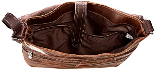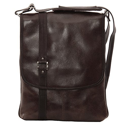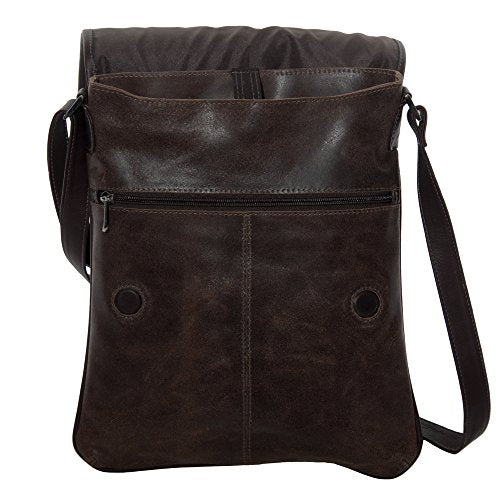 Details: Flap opening with dual magnetic closure reveals a large front zip-pocket, rear compartment, and main compartment with a laptop pocket. Long single adjustable strap with a moveable shoulder pad. Rear vertical zip-pocket.