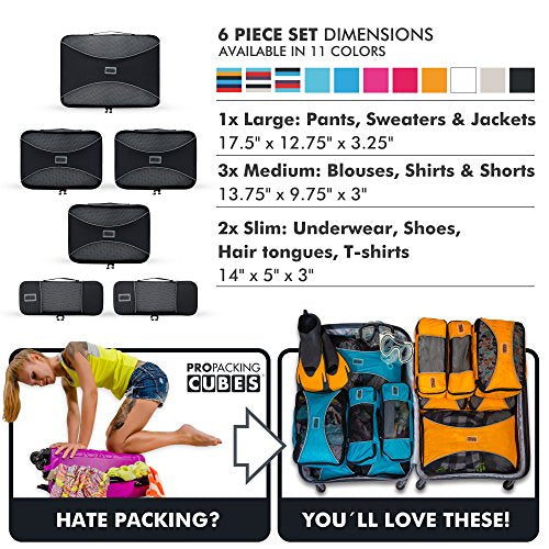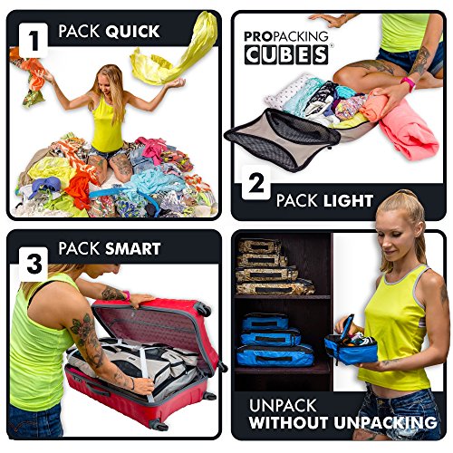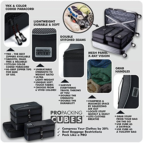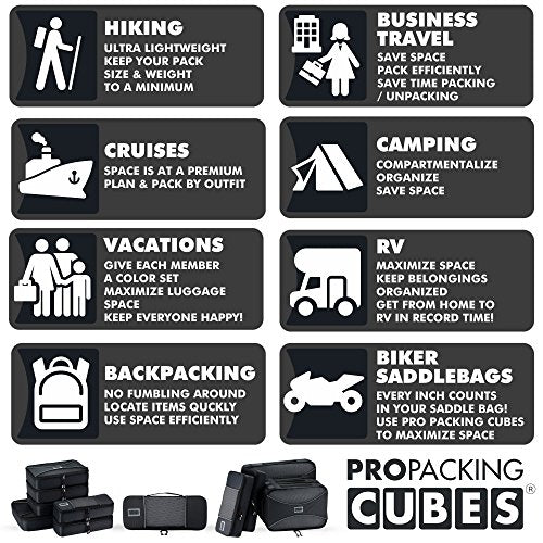 - PRO PACKING CUBES best travel cubes 6pc compression set for carry-on luggage, suitcase and backpacking. Offered in a variety of striking colors, they're perfect for couples and families sharing luggage space. Ultra-lightweight, durable construction and vivid colors are why they come up top in travel cube reviews.