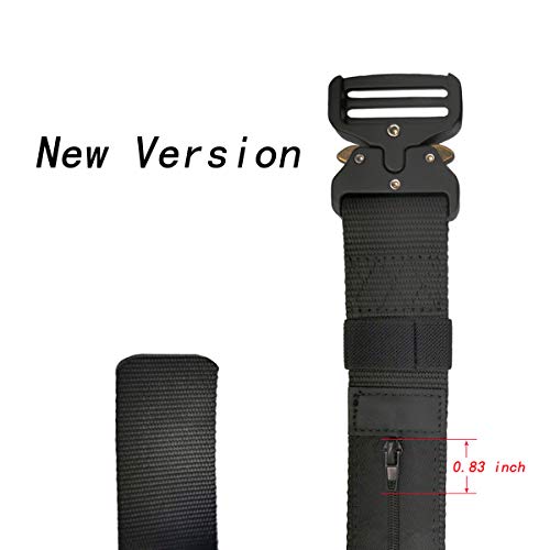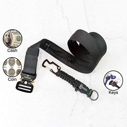Details: ANTI-THEFT TACTICAL BELT with clever hidden pocket inside the belt. The concealed bag that gives you complete security for money, keys, and everything else. This leaves even the most skilled pickpocket clueless that you're carrying valuables. The high tech buckle is made of rugged zinc alloy. The quick release buttons let you open the belt, but no one else can. Fully adjustable to give both men and women complete comfortable. We add an EDC Paracord with 5 tools at no additional cost. This includes a flint rod and scraper for starting a camp fire, whistle to call for help or notify friends of your location, key ring to prevent loss or theft, screw wrench for quick fixes, and bottle opener to give ready access to your favorite refreshments and libations. This is the ultimate belt for travel, big events, camping, hiking, and every day. P.S. You can adjust or cut the length of the belt by yourself, if it is too long. *Not suitable for riggers, Molle pouches, gun holsters Product Measurements: * Belt web length: 122-125CM (49"±1") Width: 3.8CM (1.5") Thickness: 0.255CM (0.11") Suitable for waist circumference 28 to 42 inches * Buckle size: 5.7CM (2.24") Thickness: 0.9CM (0.35") Buckle width: 5CM (1.97") * Zipper bag: 26" * Included Paracord measures 45" * Package includes: 1 x Nylon hidden money belt 1 x EDC Paracode hook