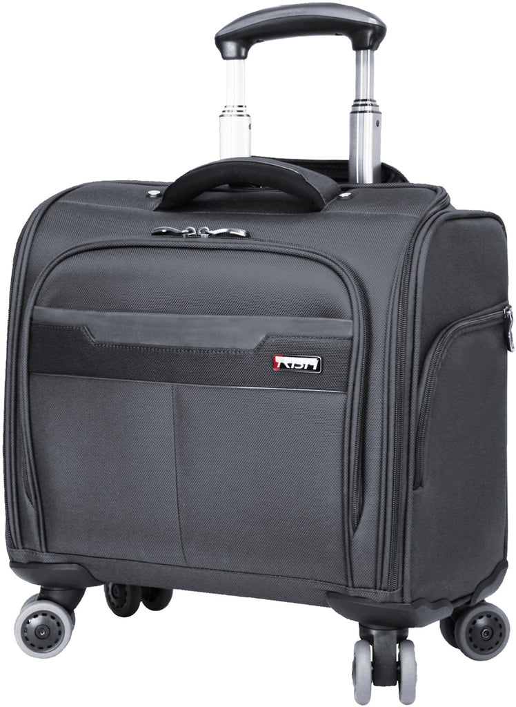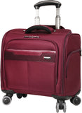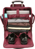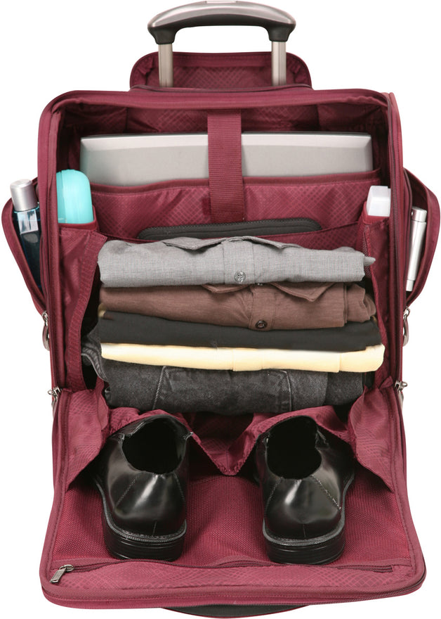 - Main compartment zips completely open and includes built-in shoe pockets.