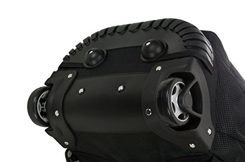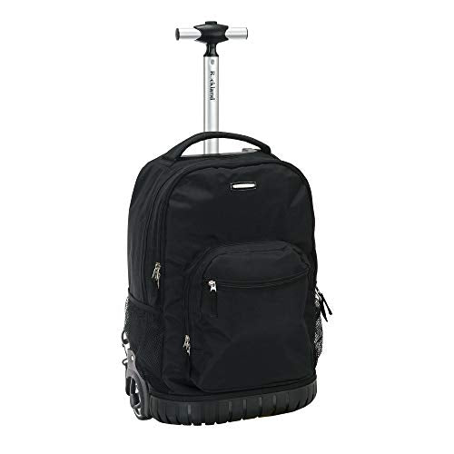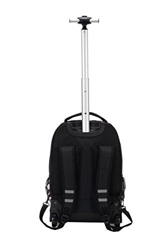 Details: Rolling backpack with skate wheels and retractable t-handle. Measures 13 inch l x10 inch w x 19 inch h. Features include 2 zippered compartment pockets on the front of the bag with the smaller having a built in organizer. Zippered main compartment has a padded compartment for a laptop and two mesh side pockets. Fabric handle at the top and sturdy retractable t-handle with an ergonomic grip is built to last. Bag made of durable polyester with metal telescoping handle and heavy duty plastic base on bottom to keep the bag standing and protects the fabric from dirt and wear. Padded shoulder pads allows the bag to be carried comfortably on the back as an option.