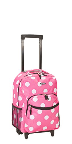 Details: Rolling backpack with double skate wheels. Measures 13 inch lx10 inch wx17 inch h. Features include 2 zippered pockets on the front of the bag with one having a built in organizer. Zippered main compartment opens to large storage opening, and two mesh side pockets. Fabric handle at the top and telescoping pull handle. Bag made of durable polyester with metal telescoping handle and heavy duty plastic stand on bottom to keep the bag standing.