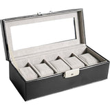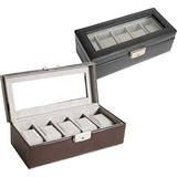 Details: Showcase your fine watches in a luxury watch box. Your collection of fine watches deserves more than just a cluttered corner in your dresser drawer. It deserves the elegance of our 5 Watch Box expertly crafted with striking genuine leather. Available in bold black or warm brown, the glass topped case contains 5 velvet pillows to cradle your favorite watches, while hand milled hardware secures and highlights the front of the case.