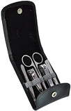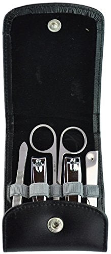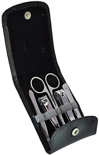 Details: Flip Genuine Leather case with snap closure. Includes tweezers, nail clipper, cuticle scissors, toe nail clipper and a folding nail file.