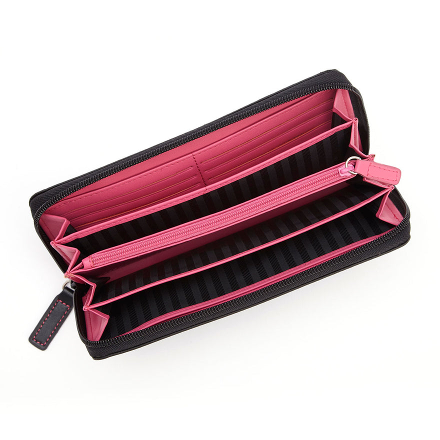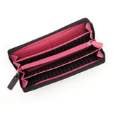 Spacious vibrant this fan Wallet features genuine leather exterior with contrast stitching juxtaposed against a gorgeous wildberry interior.