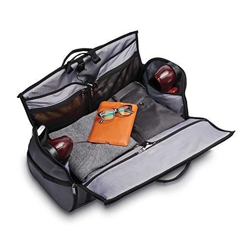 Details: Innovative design and creative engineering make the Convertible Duffel a game changer for multi-functional travel. Blending the best features from a garment bag with the easy, flexible packing of a duffel, this versatile style is the ultimate, go everywhere, travel option.3-1 Convertibility Shoulder - unclip and tuck the backpack straps inside the discreet sleeve, attach and adjust the shoulder strap to comfortably carry on the shoulder Crossbody - when packed full, adjust the shoulder strap to wear across the body for a more comfortable, secure, hands free commuting mode Hand Held - removing the shoulder strap, carry using the top handles for a handheld optionProduct Features Water Resistant Fabric - body fabric features a water resistant coating for protection against the elements Hot Corner Organization - unique to this collection, the front interior pockets and Key FOB were thoughtfully designed to function in all carry modes without compromising the security or your personal essentials RFID Data Vault - protected pockets safeguard your travel essentials from identify theft Customizable Packing Design - pack this style as a traditional duffel, a garment bag with capacity for 2 full suits, or maximize and pack as both Smartsleeve™ - fits over most upright handles for hassle-free combination travel Key FOB - secure and locate keys stress free Side Carry Handles - provide alternative carry optionsWeight Without Shoulder Strap: 2.5 lbs.Weight With Shoulder Strap: 3.0 lbs. Weight: 3.0 lbs.Body Dimensions: 22.0" x 12.5" x 12.0"