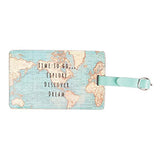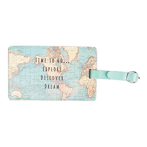 - This luggage tag features a vintage world map print with the phrase, 'Time to go... Explore, Discover, Dream'.