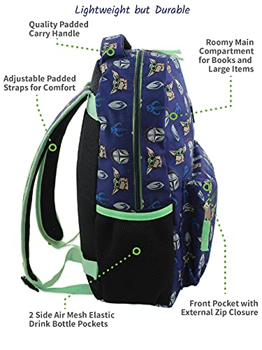 - WELL CONSTRUCTED AND COMFORTABLE - This quality Baby Yoda book bag can be hung up when not in use by the padded handle. This Star Wars school bag is designed in durable fabric with adjustable foam padded shoulder straps to relieve stress from your child's shoulders, and a padded back for added comfort. The length of the shoulder straps is adjustable for the perfect fit. The side mesh pockets are made from athletic mesh for extra durability.
