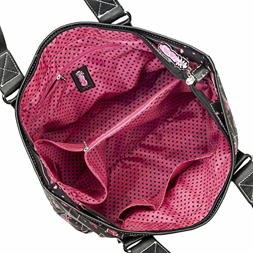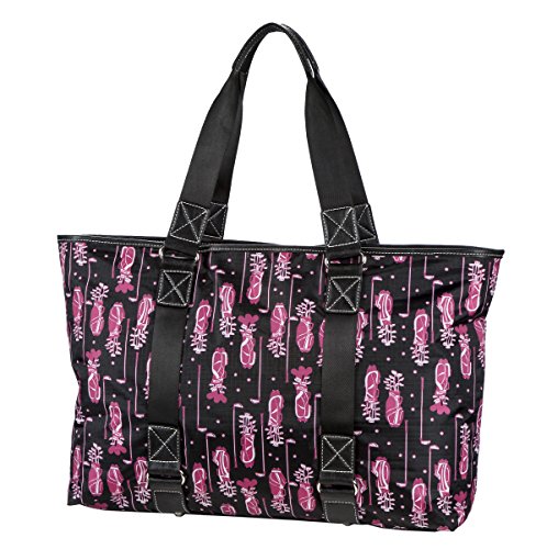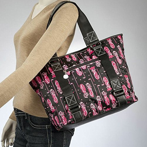 Details: Sporty and fun multicolor golf bag print. Water resistant light weight polyester nylon material.. Accented with black faux leather and silver colored hardware. Double shoulder straps. Top zip entry with golf bag zipper pull. Interior fully lined with signature Sydney Love polka dot fabric. Two slide pockets, perfect for cell phone and other small accessories.
