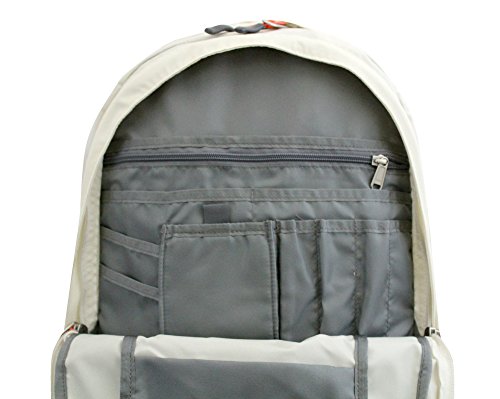 - Womens backpack. Large exterior mesh slip pockets. Two water bottle mesh pockets. Front stash pocket. Secondary pocket with tablet sleeve, zippered pocket and 9 slip pockets. Fits most 15" laptops. Side compression straps. Side release buckle closure. Two-way zip closures. Women's specific injection-molded with padded shoulders. 420-denier nylon fabric. 18" x 13" x 3" Color: Heathered Zinc Grey Pink / Silver Hardware H: 18.00 in x W: 3.00 in x L: 13.00 i