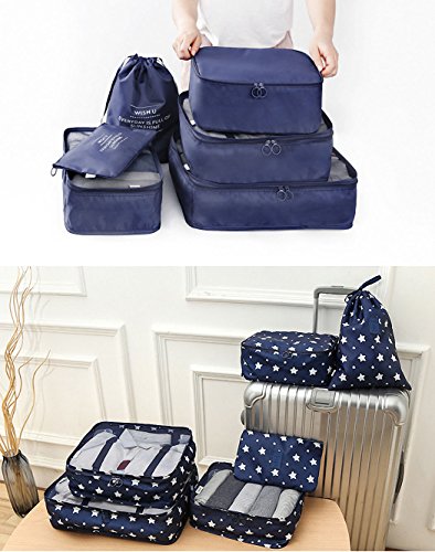 - ◎ 6 Sets Includes : 1 Extra Cube ( 16.5 * 12.6 * 4.7 in ) & 1 Large Cube ( 13.4 * 11 * 4.7 in ) & 1 Medium Cube ( 12.6 * 9.1 * 4.7 in ) & 1 Small Cube ( 11 * 7.9 * 4.7 in ) & 1 Large Pouch ( 14.2 * 10.6 in ) & 1 Slim Pouch ( 10.6 * 6.3 in ) . The Cubes for the Clothing , Underwear , Bra , Socks . Extra Bag With the Shoes , Dirty Cloth , And Other Organizer Can Hold the Toiletry , Accessories , Makeup , Cosmetic and More .