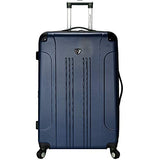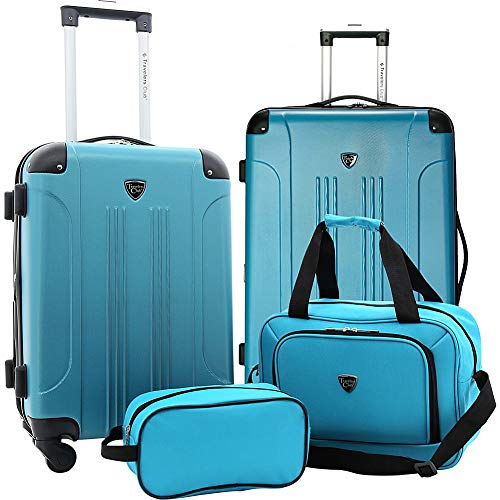 Details: Traveler's Club chic A Go Plus 4Pc hardside expandable spinner luggage set is constructed from durable ABS material with an embossed finish for scratch resistance and features a telescoping trolley handle system, 4 double spinner wheels for multi-directional mobility, and deluxe corner guards to absorb impact. This set includes 28" Upright, 20" Carry-on, boarding tote and 10" Travel kit.