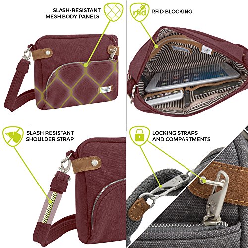 Details: American inspired with a modern twist - this crossbody bag works equally well for travel and everyday use. It features a roomy compartment with zippered rfid blocking pocket. Features an easy access, locking front zippered pocket and rear zip pocket. Anti-theft features including slash-resistant construction, locking compartments, slash-resistant and locking straps will keep you and your belongings protected. Strap adjusts for customized comfort. Crafted in a durable cotton canvas with rich suede trim, matte nickel hardware and classic pinstriped lining. The travelon anti-theft heritage crossbody will quickly become your favorite companion bag.