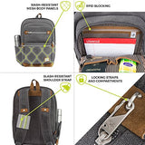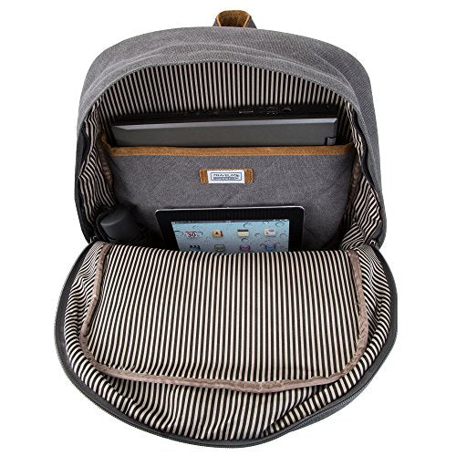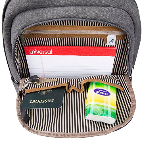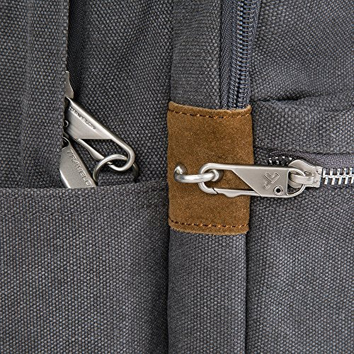 Details: American inspired with a modern twist - this backpack works equally well for travel and everyday use. It features a roomy main compartment with padded sleeve to hold to a 15.6 inch laptop. Two easy accesses, locking front compartments and organizer includes a zippered rfid blocking pocket. Anti-theft features have slash-resistant construction, locking compartments, slash-resistant adjustable straps will keep you and your belongings protected. Crafted in a durable cotton canvas with rich suede trim, matte nickel hardware and classic pinstriped lining. The travelon anti-theft heritage backpack will quickly become your favorite companion bag.