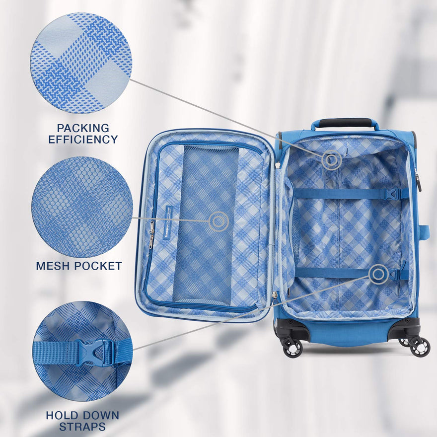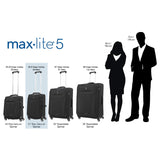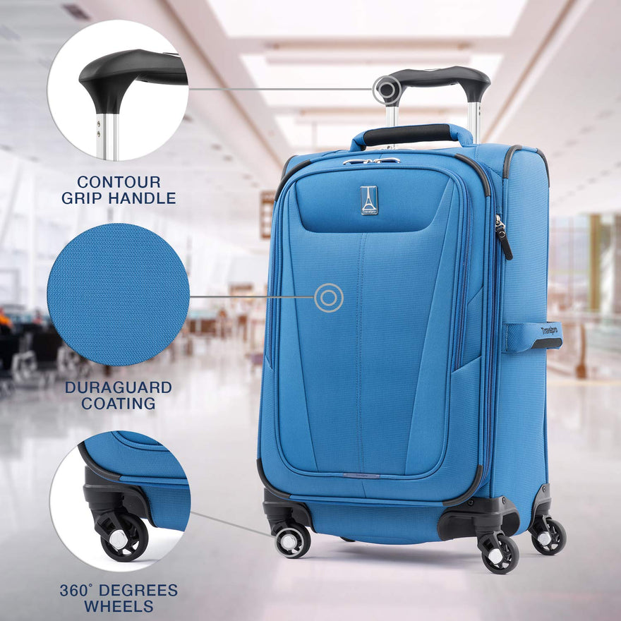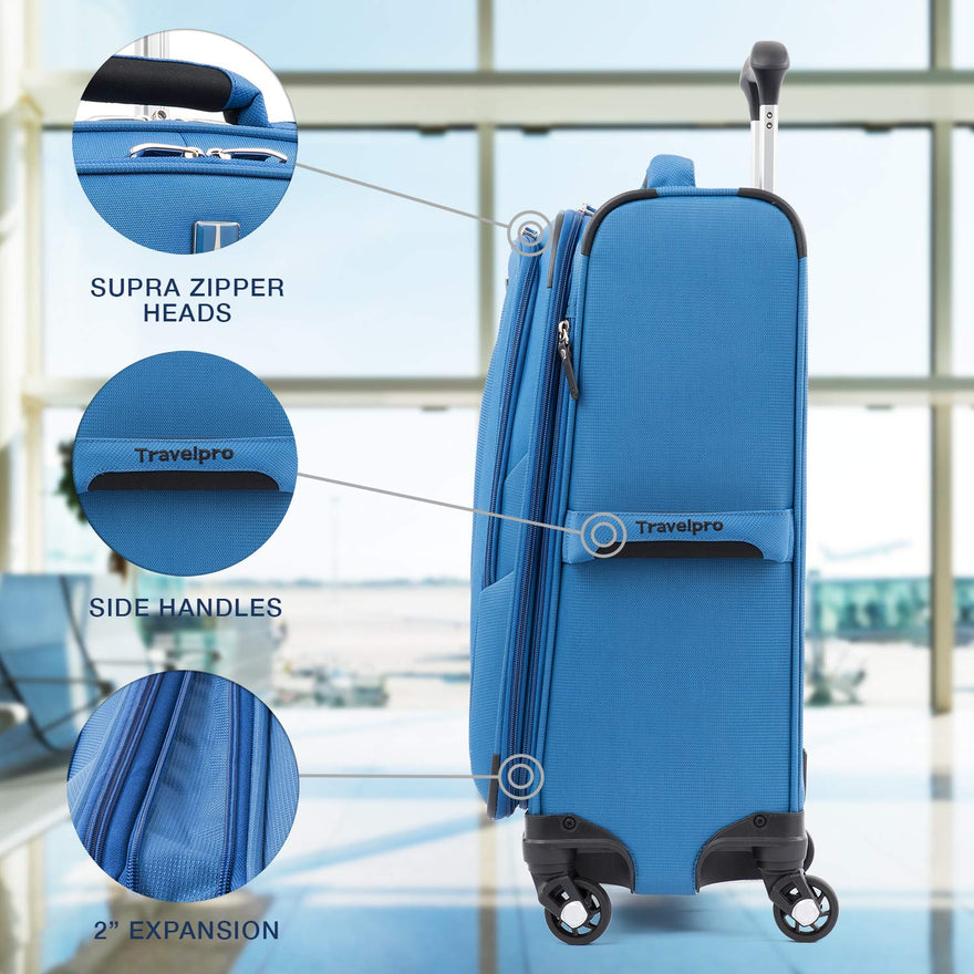 Details: This carry-on soft-sided spinner is so light, it flies! one of our lightest wheeled carry-on suitcases, the Maxlite 5 21" expandable spinner is designed for ultimate comfort and mobility, featuring a 2-position adjustable PowerScope lite handle with patented Contour grip and 4-wheel 360 degree rotating spinners that glide effortlessly. Enjoy packing convenience with two quick-access, exterior front pockets, full-length interior lid pocket, side accessory pocket and adjustable hold-down straps, while the high-tensile-strength expandable zipper gives you maximum packing flexibility. Backed by a new and expanded trusted traveler promise-for worry-free warranty coverage from Travelpro.