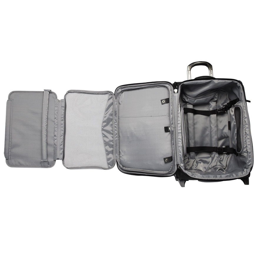 Details: The Travelpro Crew 11 22" Expandable Rollaboard Suiter Suitcase is the civilian version of the famous carry-on traveler's bag that professional flight crews have depended on for decades the world over. Includes an external USB port for powering up any USB-powered device from the dedicated charger pocket that makes searching for an open wall outlet a thing of the past (portable charger/power pack not included). Constructed of high-quality ballistic nylon with a DuraGuard coating for stain and scratch resistance, this durable luggage rolls along smoothly with crash-guard wheel housings, skid guards and molded corner guards. A PowerScope Extension Handle reduces wobbling and features stops at 38", 40" and 42.5" lengths. Smart packing is easy and secure in this durable suitcase that expands two extra inches and offers a deluxe suiter to help keep suits, dresses, and dress shirts wrinkle-free during transport, adjustable hold-down straps, a full-length interior lid pocket, wet pocket and damage-resistant SUPRA zipper heads. This Fit to Fly carry-on rollaboard has been sizer been tested to accommodate overhead bin space on most major US airlines. Fully expanded Carry-On may not meet airline restrictions. Backed by our built for a lifetime limited worry free warranty that covers the cost of repair for damage from airline or other common carrier for the first 3 years after registration under the trusted companion promise.