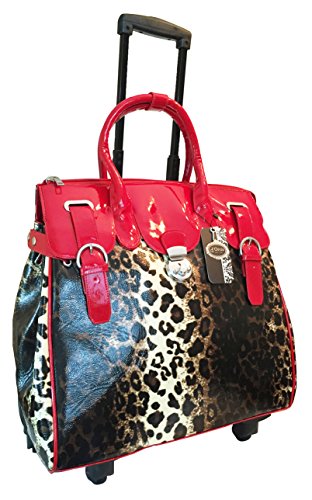 Details: 1 main zipper compartment. Small zipper pocket in front hidden under flap. Inside: 1 small pocket, 1 small zipper pocket and attached padded laptop area with securing velcro strap. Padded laptop area can fit laptop 11" wide, 10" tall and 1.5" thick using securing velcro strap Padded laptop area can fit laptop 11" wide, 12" tall and 1.5" thick without using securing velcro strap. Horizontal Straps/belts across top to reinforce bag when closed. 4 spinner 360 degree wheels. 2 straps front & back so the bag can be carried like a purse. Extendable handle with push button. Thick strap in back is used to cover mechanics of handle. Small decorative lock in front.
