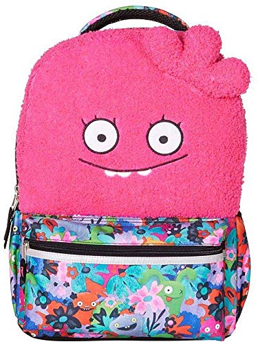 - Darling Ugly Dolls 16" Backpack with fuzzy pink coloring and an all-over ugly doll print on the pockets